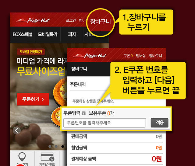 이 이용약관(이하 “약관”)은 한국피자헛유한회사(이하 "회사")에서 제공하는 피자헛 인터넷 서비스를 이용함에 있어, 가입조건 및 이용에 관한 제반 사항과 기타 필요한 사항을 구체적으로 규정하며, 이용자가 등록절차를 거쳐서 ‘등록하기’ 단추를 누르면 이 “약관”에 동의하는 것으로 간주됩니다. 또한, 2013년 2월 7일부로 이메일 수신동의자를 대상으로 “회사”가 발송하는 우편물 발송에 동의한 것으로 간주됩니다.